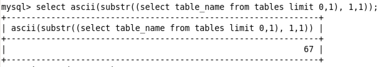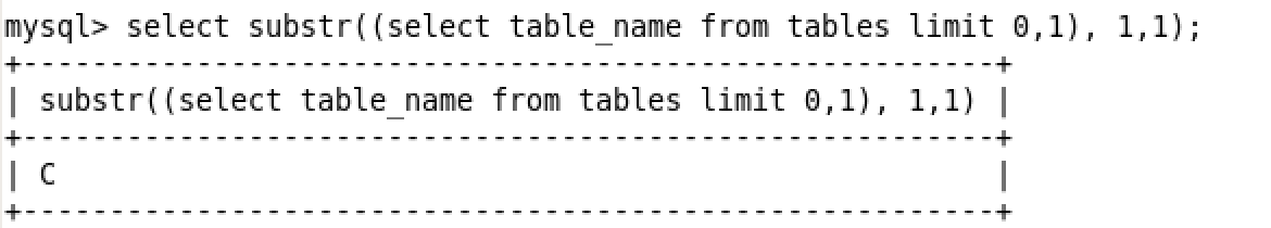 -문자열을 잘라서 원하는 문자열만 출력 select substr((select table_name from tables limit 0,1), 1,1); 이 코드는 substr이라는 함수를 사용하고 자신이 자르고 싶은 문자열이 무엇인지 파라미터로 정의를 한다. 그리고 어디서부터 어디까지 자를 것인지 입력을 하면 된다. 위 코드는 tables라는 테이블에 있는 table_name 이라는 행에 있는 문자열의 0번째(컴퓨터 기준)에 있는 문자열을 정의한 것이고, 이 문자열을 1번째 부터 1번째 알파벳까지 자른다고 정의하는 것이다.