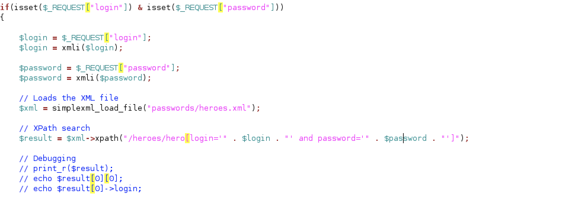 코드를 보면 login과 password 정보가 일치하면 출력을 해주는 코드가 있다. 하지만 xml은 soap처럼 주석이 들어가지 않는다.